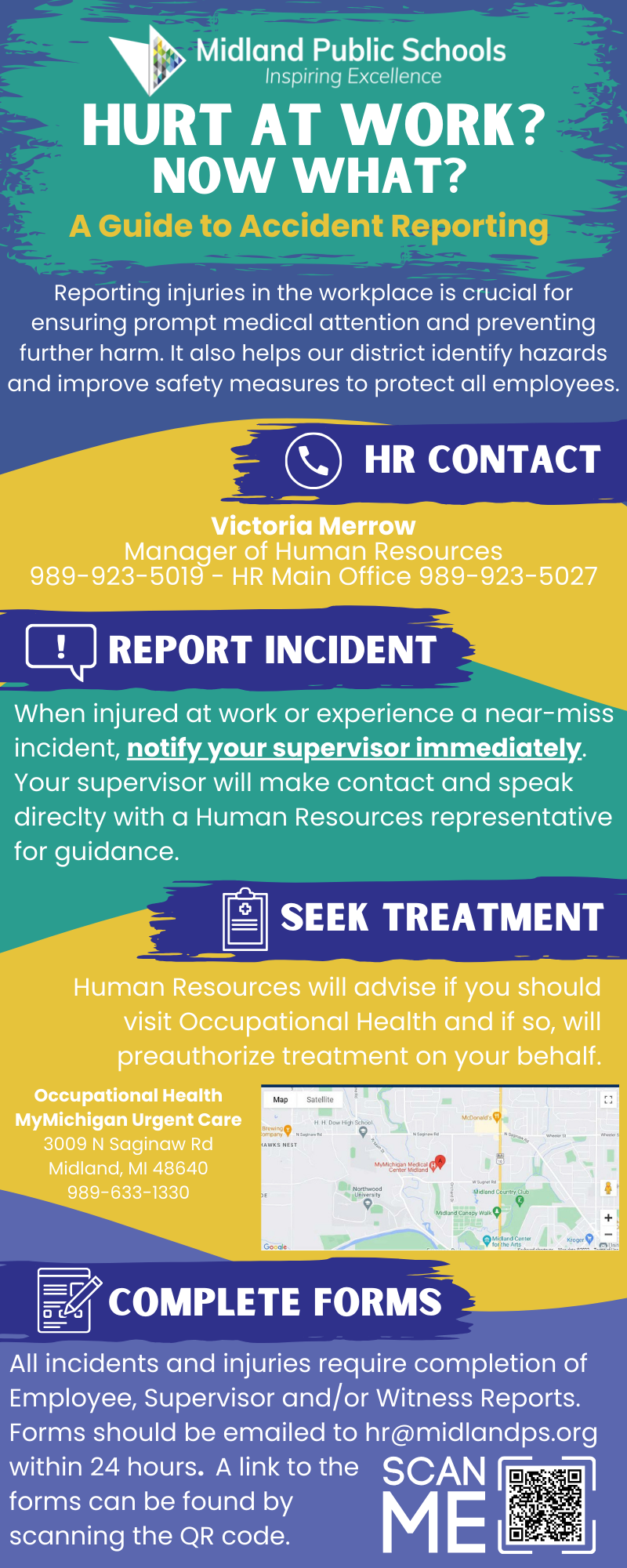 We understand that dealing with incidents and injuries can be tough. Please complete the necessary Employee, Supervisor, and/or Witness Reports and email them to hr@midlandps.org within 24 hours. Thank you for your cooperation.